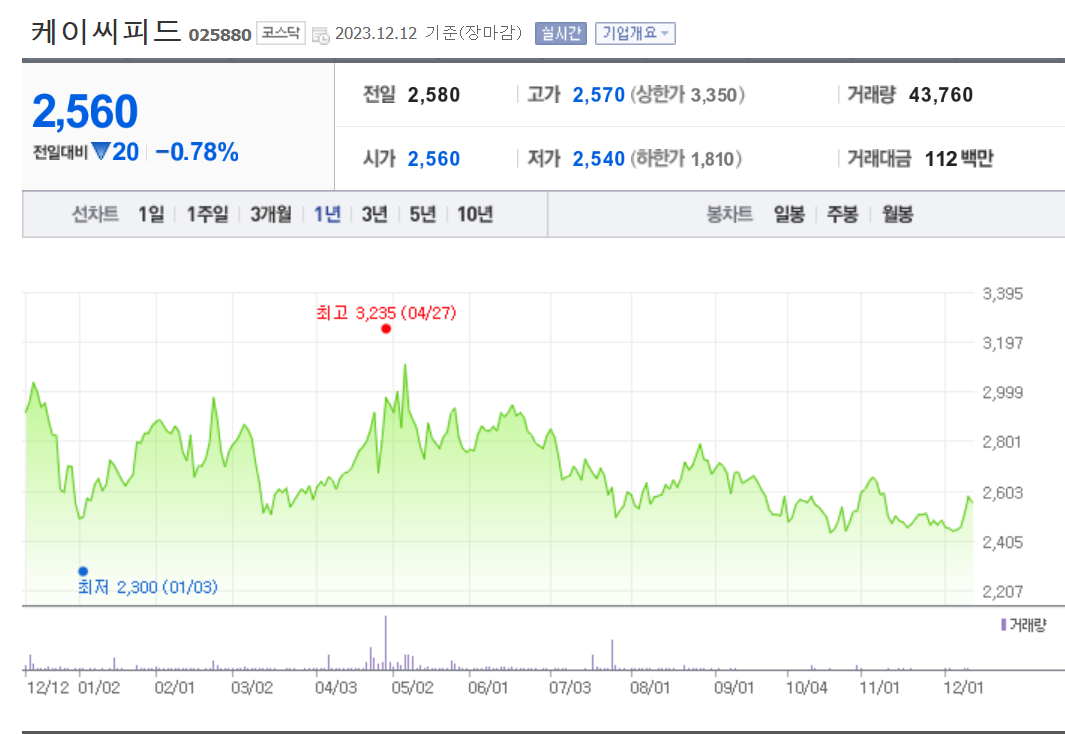 케이씨피드는 식료품 기업으로 주가는 2,560원이며 전일 대비 -0.78%의 모습을 보이고 있습니다. 케이씨피드의 주주현황을 살펴보면 정한식(외 5인)이 지분 27.03%를 소유하고 있습니다. 케이씨피드의 시가 총액은 428억 원이며 발행 주식수는 16,715,858주 입니다. 외국인 보유 비중은 10.64% 이며 장중 거래량은 43,760을 기록했습니다. 매출액은 669억 원, 영업이익은 49억 원을 달성했습니다. EPS는 337원이며 케이씨피드 주식 배당수익률은 1.95% 입니다.