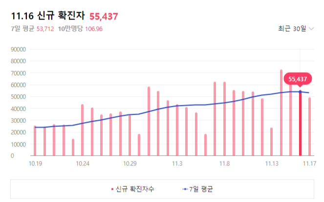 코로나의 신규확진자 수는 55,437명(22년 11월 16일 기준)으로 집계되고 있고 누적확진자는 26,462,319명(22년 11월 17일 14:00기준)으로 집계되고 있습니다. 그나마 한국은 사망률은 0.1%정도로 다른 국가들에 비해서 감염자 수 대비 사망률이 낮은 나라입니다.