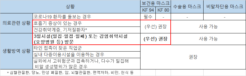 코로나 예방에 가장 큰 도움이 되는 것은 마스크 착용입니다. 침방울을 통한 감염 전파를 차단하기 때문에 옳바르게 마스크를 착용하는 것이 가장 중요합니다. 질병관리청에서 상황별로 권장하는 마스크는 아래와 같습니다.