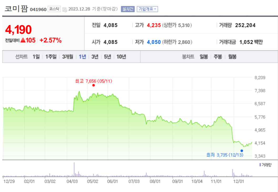 코미팜 주가와 경구용 PED 생백식 개발 소식