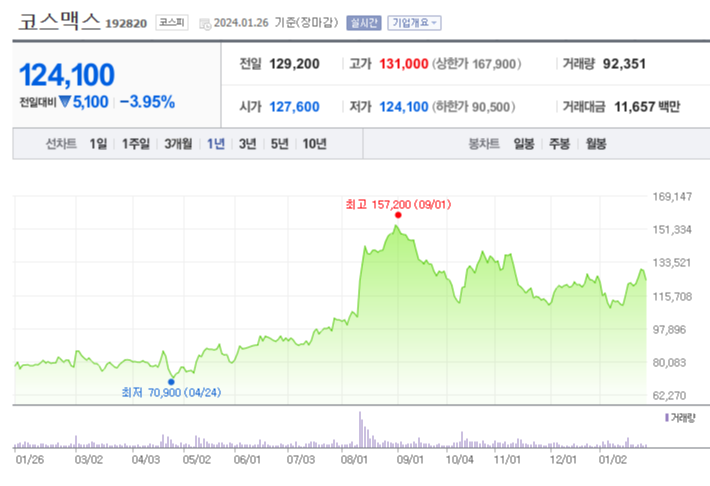 코스맥스의 현재 주가는 124,100원이며 전일 대비 -3.95%의 하락세를 보이고 있습니다. 주주현황을 살펴보면 코스맥스비티아이(외 16인)이 지분의 26.26%를 소유하고 있습니다. 코스맥스는 개인생활용품 기업으로, 시가 총액은 1조4720억 원이며, 코스피 181위 기업입니다. 발행 주식수는 11,349,509주입니다. 외국인 보유 비중은 29.89%이며, 거래량은 92,351주를 기록했습니다. 또한, 코스맥스의 매출액은 13,408억 원을 달성했습니다.