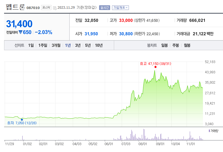 펩트론, 전날 하락 이어 7% 급락…3만3000원선 밑으로 < 증시 < 경제 < 기사본문 - 이코노뉴스 (econonews.co.kr)