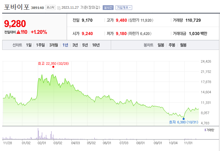 포바이포는 미디어 기업으로 주가는 9,280원이며 전일 대비 +1.20%의 모습을 보이고 있습니다. 포바이포의 주주현황을 살펴보면 윤준호(외 4인)이 지분 28.70%를 소유하고 있습니다. 포바이포의 시가 총액은 1028억 원이며 발행 주식수는 11,073,235주 입니다. 외국인 보유 비중은 1.42% 이며 장중 거래량은 110,729를 기록했습니다. 매출액은 130억 원, 영업이익은 -105억 원을 달성했습니다. EPS는 -1,360원이며 BPS는 4,801원 입니다.
