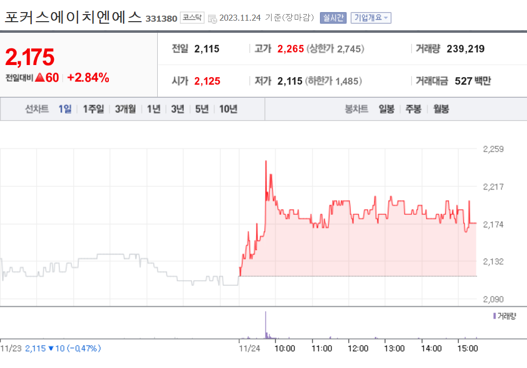 포커스에이치엔에스는 보안장비 기업으로 현재 주가는 2,175원이며 전일 대비 +2.84%의 모습을 보이고 있습니다. 포커스에이치엔에스의 주주현황을 살펴보면 김대중(외 2인)이 지분 37.69%를 소유하고 있습니다. 포커스에이치엔에스의 시가 총액은 414억 원이며 발행 주식수는 19,048,582주 입니다. 외국인 보유 비중은 1.48% 이며 장중 거래량은 239,219를 기록했습니다. 매출액은 315억 원, 영업이익은 27억 원을 달성했습니다. EPS는 127원이며 포커스에이치엔에스 주식 배당수익률은 1.38% 입니다.