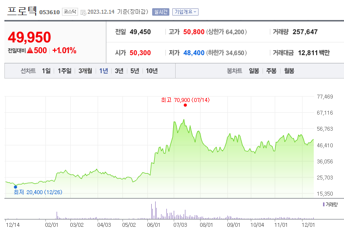 프로텍 현재 주가는 49,950원이며 전일 대비 +1.01%의 모습을 보이고 있습니다. 프로텍의 주주현황을 살펴보면 최승환(외 1인)이 지분 29.90%를 소유하고 있습니다. 프로텍는 반도체 및 관련장비 기업으로 시가 총액은 5494억 원이며 발행 주식수는 11,000,000주 입니다. 외국인 보유 비중은 2.02% 이며 장중 거래량은 257,647을 기록했습니다. 매출액은 983억 원, 영업이익은 601억 원을 달성했습니다. EPS는 1,469원이며 프로텍 주식 배당수익률은 1.00% 입니다.