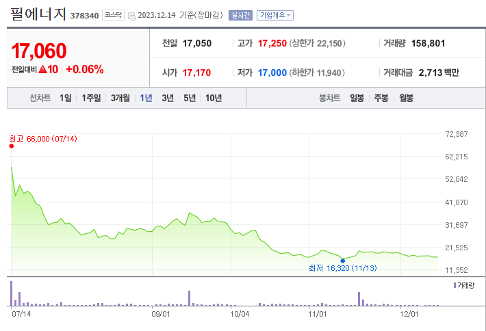 필에너지 현재 주가는 17,060원이며 전일 대비 +0.06%의 모습을 보이고 있습니다. 필에너지의 주주현황을 살펴보면 필옵틱스(외 1인)이 지분 47.76%를 소유하고 있습니다. 필에너지는 전자 장비 및 기기 기업으로 시가 총액은 3618억 원이며 발행 주식수는 21,208,882주 입니다. 외국인 보유 비중은 195,780% 이며 장중 거래량은 21,208,882를 기록했습니다. 매출액은 1,342억 원, 영업이익은 168억 원을 달성했습니다. EPS는 248원이며 BPS는 5,820원 입니다.