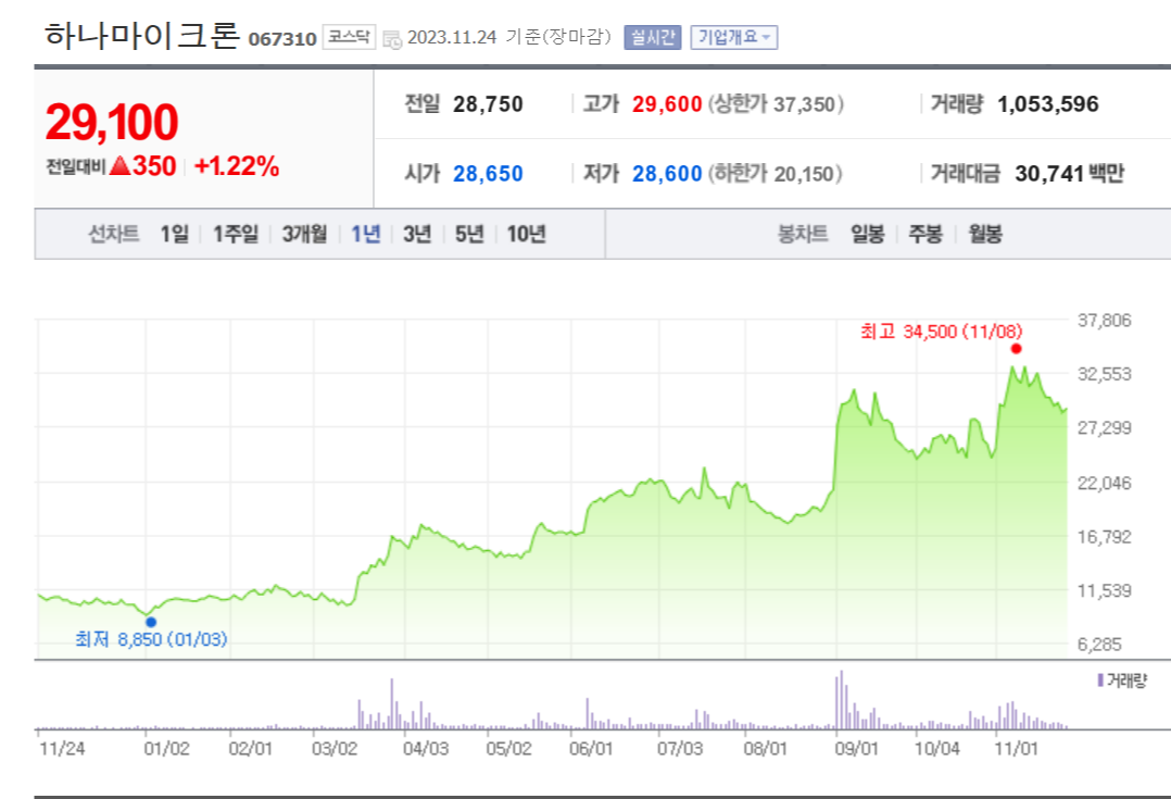 하나마이크론는 반도체 및 관련장비 기업으로 주가는 29,100원이며 전일 +1.22%의 모습을 보이고 있습니다. 하나마이크론의 주주현황을 살펴보면 최창호(외 8인)이 지분 27.92%를 소유하고 있습니다. 하나마이크론의 시가 총액은 1조3945억 원이며 발행 주식수는 47,921,854주 입니다. 외국인 보유 비중은 10.70% 이며 장중 거래량은 1,053,596을 기록했습니다. 매출액은 4,871억 원, 영업이익은 1,035억 원을 달성했습니다. EPS는 -135원이며 하나마이크론 주식 배당수익률은 0.17% 입니다.