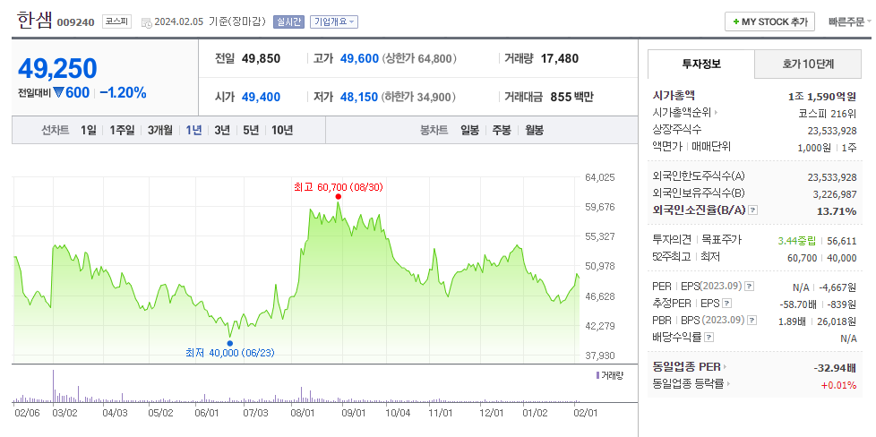 한샘의 현재 주가는 49,250원이고, 전일 대비 -1.20%으로 하락하였습니다. 주주현황을 살펴보면 하임유한회사(외 6인)가 지분의 35.97%를 소유하고 있습니다. 한샘은 내구소비재 기업으로, 시가 총액은 1조 1590억 원입니다. 발행 주식수는 23,533,928주이며, 외국인 보유 비중은 13.71%입니다. 장중 거래량은 17,480주를 기록하였고, 매출액은 14,649억 원입니다.