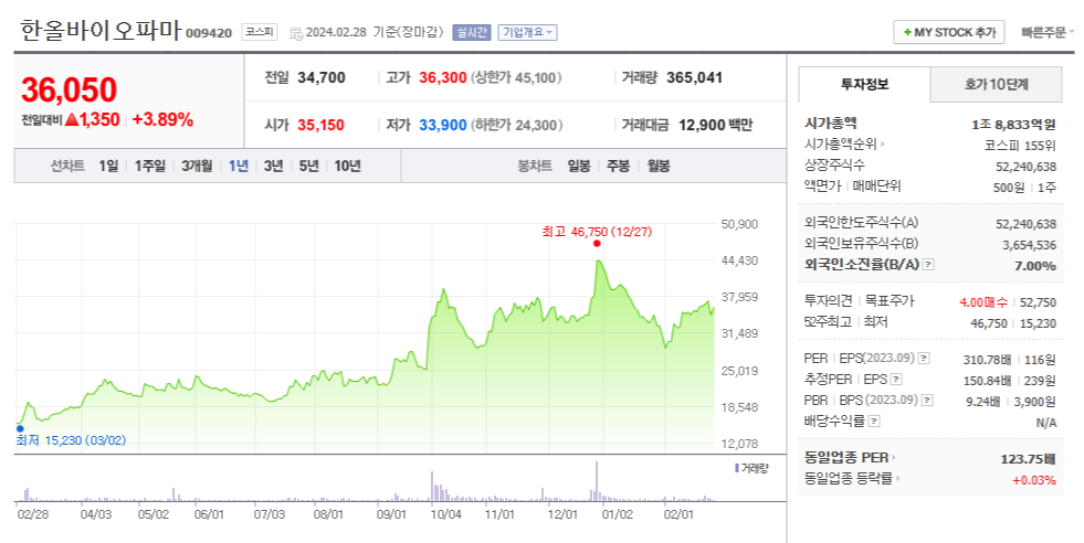 한올바이오파마의 현재 주가는 36,050원이며, 전일 대비 +3.89% 상승한 모습을 보이고 있습니다. 주주 현황을 살펴보면, 대웅제약(외 5인)이 지분의 32.37%를 소유하고 있습니다. 한올바이오파마는 제약 기업으로서, 시가 총액은 1조 8833억 원이며, 발행 주식수는 52,240,638주입니다. 외국인 보유 비중은 7.0%이며, 장중 거래량은 365,041주를 기록했습니다. 또한, 한올바이오파마는 매출액으로 1,032억 원을 달성했습니다.