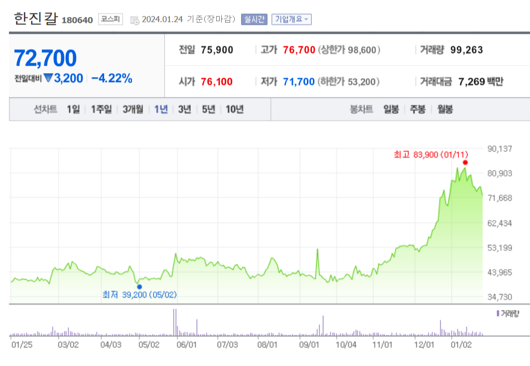 한진칼의 현재 주가는 72,700원이며 전일 대비 -4.22%원의 모습을 보이고 있습니다. 주주현황을 살펴보면 조원태(외 9인)이 지분 29.32%를 소유하고 있습니다. 한진칼은 항공운수 기업으로, 시가 총액은 4조8536억 원이며 코스피 75위 기업입니다. 발행 주식수는 66,762,279주입니다. 외국인 보유 비중은 19.46%이며 장중 거래량은99,263을 기록했습니다. 매출액은 2,048억 원을 달성했습니다.