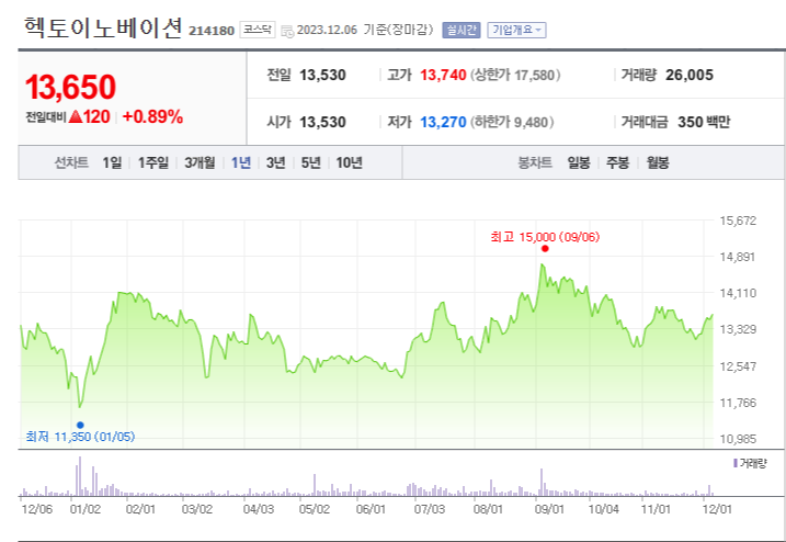 헥토이노베이션는 IT 서비스 기업으로 주가는 13,650원이며 전일 대비 +0.89%의 모습을 보이고 있습니다. 헥토이노베이션의 주주현황을 살펴보면 이경민(외 2인)이 지분 30.42%를 소유하고 있습니다. 헥토이노베이션의 시가 총액은 1810억 원이며 발행 주식수는 13,257,185주 입니다. 외국인 보유 비중은 13.81% 이며 장중 거래량은 26,005를 기록했습니다. 매출액은 2,152억 원, 영업이익은 356억 원을 달성했습니다. EPS는 1,958원이며 헥토이노베이션 주식 배당수익률은 3.08% 입니다.