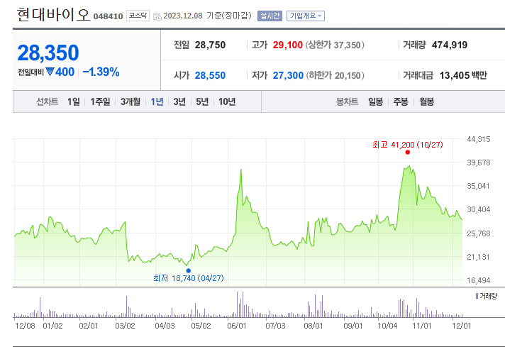 현대바이오는 개인생활용품 기업으로 주가는 28,350원이며 전일 대비 -1.39%의 모습을 보이고 있습니다. 현대바이오의 주주현황을 살펴보면 씨앤팜(외 4인)이 지분 12.91%를 소유하고 있습니다. 현대바이오의 시가 총액은 1조1286억 원이며 발행 주식수는 39,810,008주 입니다. 외국인 보유 비중은 6.48% 이며 장중 거래량은 474,919를 기록했습니다. 매출액은 83억 원, 영업이익은 -264억 원을 달성했습니다. EPS는 -442원이며 BPS는 1,341원 입니다.