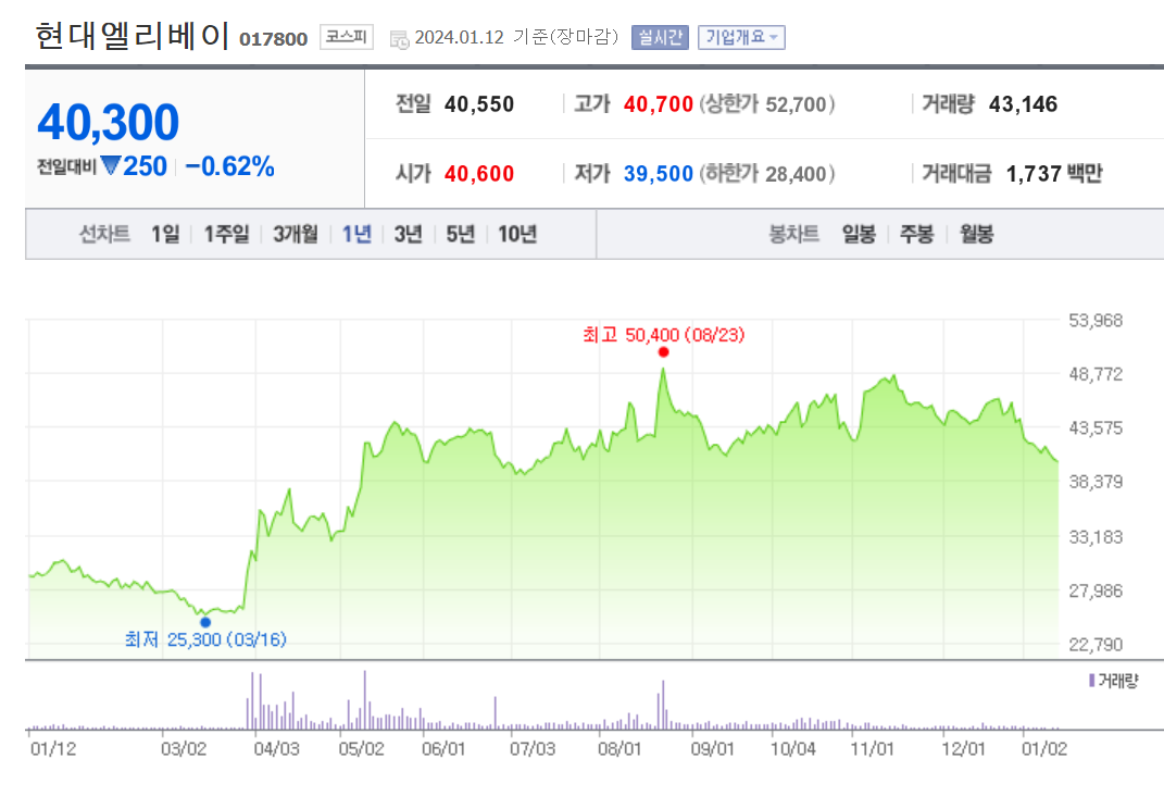 현대엘리베이의 현재 주가는 40,300원이며 전일 대비 -0.62%의 하락세를 보이고 있습니다. 현대엘리베이의 대주주는 현대홀딩스컴퍼니(외 17인)로, 지분 27.76%를 소유하고 있습니다. 현대엘리베이는 기계 기업으로, 현재 주식의 시가 총액은 1조5754억이며 코스피 165위 기업입니다. 발행 주식수는 39,092,385주입니다. 외국인의 보유 비중은 26.15%이며, 장중 거래량은 43,146주를 기록했습니다. 또한, 현대엘리베이의 매출액은 18,989억 원을 달성했습니다.