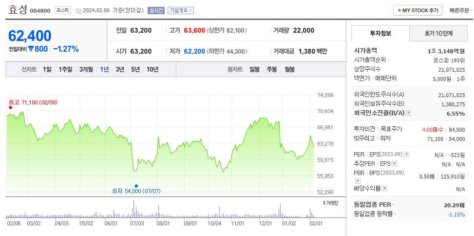 효성의 현재 주가는 62,400원이며 전일 대비 -1.27%의 변동을 보이고 있습니다. 주주현황을 살펴보면 조현준(외 14인)이 지분의 56.10%를 소유하고 있습니다. 효성은 복합 산업 기업으로, 시가 총액은 1조3148억 원이며 발행 주식수는 21,071,025주입니다. 외국인 보유 비중은 6.55%이며 장중 거래량은 22,000주를 기록했습니다. 매출액은 25,119억 원입니다.