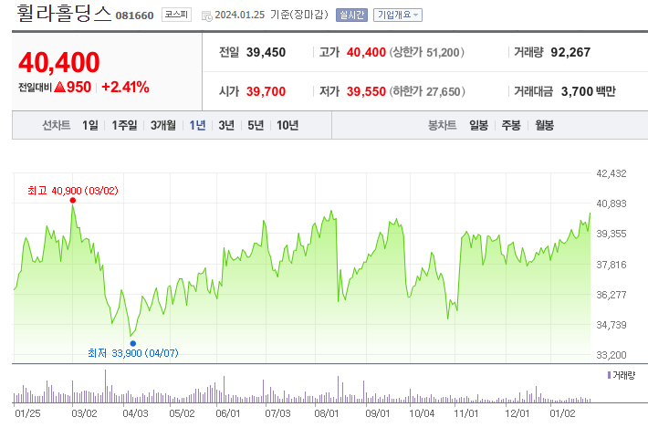 휠라홀딩스의 현재 주가는 40,400원이며 전일 대비 원의 모습을 보이고 있습니다. 주주현황을 살펴보면 피에몬테(외 5인)이 지분의 35.05%를 소유하고 있습니다. 휠라홀딩스는 섬유 및 의복 기업으로, 시가 총액은 2조 3,967억 원이며 코스피 123위 기업입니다. 발행 주식수는 60,752,222주입니다. 외국인 보유 비중은 45.09%이며, 장중 거래량은 92,267주를 기록했습니다. 또한, 휠라홀딩스의 매출액은 32,458억 원을 달성했습니다.