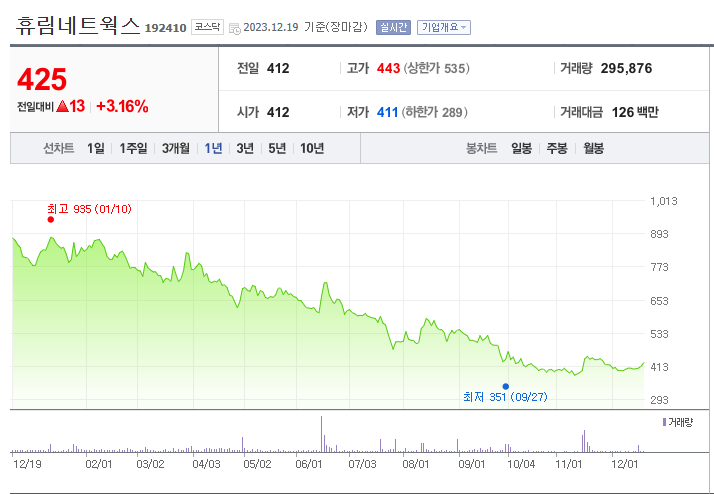 휴림네트웍스 현재 주가는 425원이며 전일 대비 +3.16%의 모습을 보이고 있습니다. 휴림네트웍스의 주주현황을 살펴보면 이 지분 15.45%를 소유하고 있습니다. 휴림네트웍스는 통신장비 기업으로 장중 기준으로 시가 총액은 462억 원이며 발행 주식수는 108,796,360주 입니다. 외국인 보유 비중은 0.55% 이며 장중 거래량은 295,876을 기록했습니다. 매출액은 127억 원, 영업이익은 -160억 원을 달성했습니다. EPS는 -259원이며 BPS는 470원 입니다.