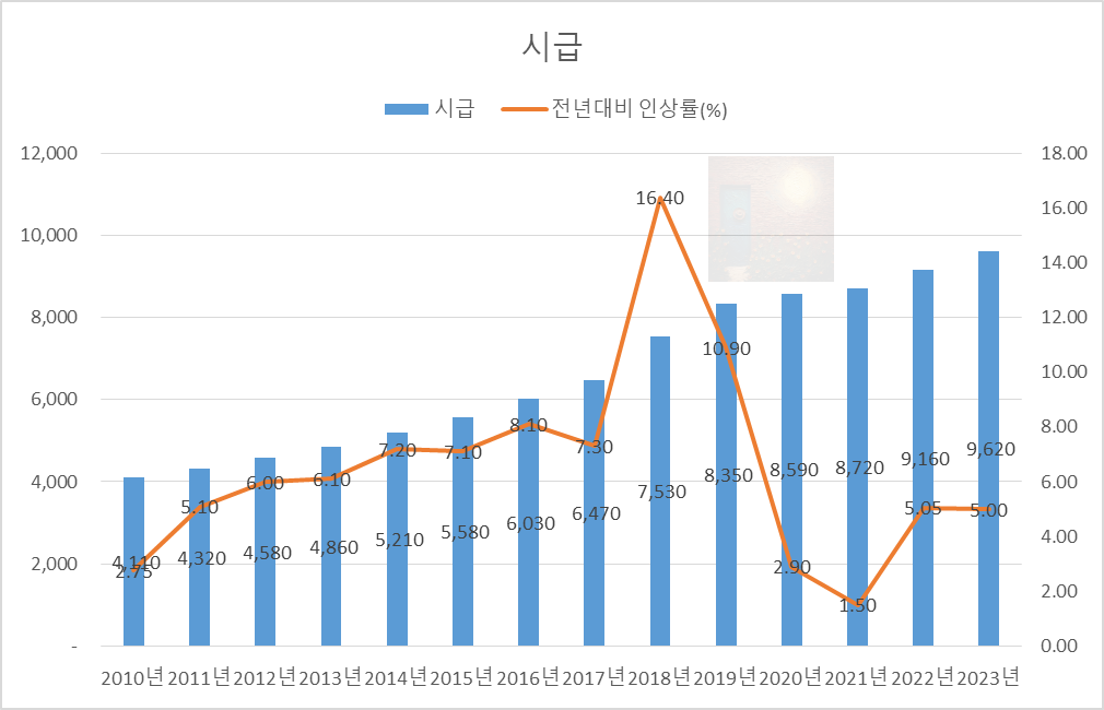 2010년부터 2023년까지 평균 390씩, 6.26% 올랐으며 최대 1060원 올랐다는 것을 알 수 있습니다.