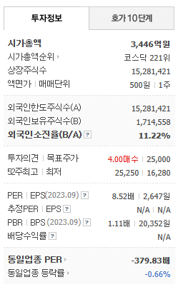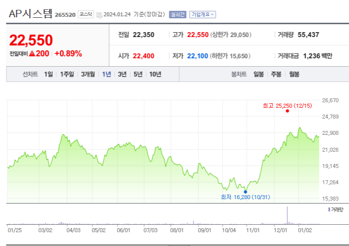 AP시스템은 현재 주가가 22,550원이며 전일 대비 +0.89%의 상승세를 보이고 있습니다. APS홀딩스(외 4인)는 AP시스템의 주주로 지분 25.07%를 소유하고 있습니다. AP시스템은 주로 디스플레이 및 관련 부품을 생산하는 기업으로, 시가 총액은 3423억 원이며 코스닥 221위 기업입니다. 발행 주식수는 15,281,421주입니다. 외국인 보유 비중은 11.22%이며, 장중 거래량은 55,437주를 기록했습니다. AP시스템은 최근 매출액으로 3,742억 원을 달성했습니다.