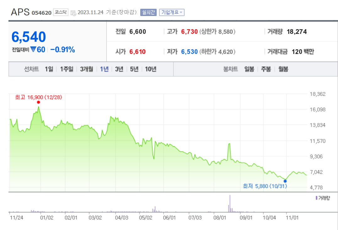 APS는 IT 서비스 기업으로 주가는 6,540원이며 전일 대비 -0.91%의 모습을 보이고 있습니다. APS의 주주현황을 살펴보면 정기로(외 5인)이 지분 31.31%를 소유하고 있습니다. APS의 시가 총액은 1334억 원이며 발행 주식수는 20,394,221주 입니다. 외국인 보유 비중은 1.56% 이며 장중 거래량은 18,274를 기록했습니다. 매출액은 136억 원, 영업이익은 -153억 원을 달성했습니다. EPS는 341원이며 BPS는 10,997원 입니다.