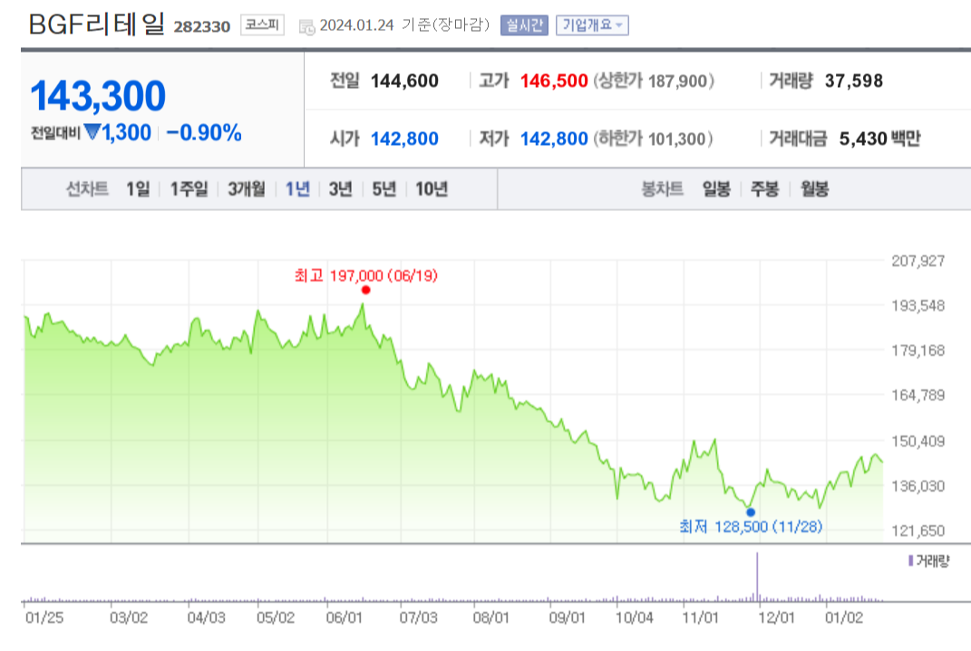 이 글은 BGF리테일의 주가 전망과 목표 주가, 그리고 기업 정보에 대해 설명합니다. 주식 투자의 핵심은 미래의 기업 가치를 예측하고 선제적으로 움직이는 것입니다. 투자 대상을 결정하기 전에 현재 기업의 상황과 수치를 검토하는 것이 필요합니다. BGF리테일 주식의 주요 상황과 투자 정보를 확인하고, 주식 투자를 돕기 위해 유용한 자료들을 모아두었습니다. 글을 끝까지 읽어보시고 투자에 도움을 받으시길 바랍니다.