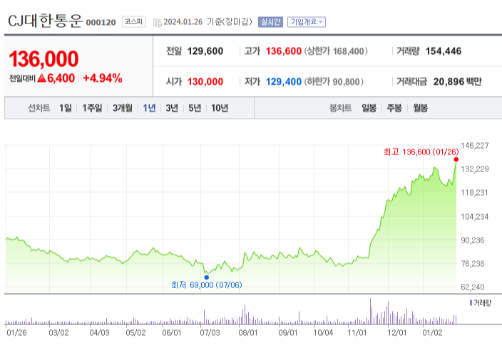 CJ대한통운의 현재 주가는 136,000원이며 전일 대비 +4.94% 큰 상승을 하였습니다. 주주현황을 살펴보면 CJ제일제당(외 2인)이 지분 40.18%를 소유하고 있습니다. CJ대한통운은 육상운수 기업으로, 시가 총액은 2조7945억 원이며 코스피 103위 기업입니다. 발행 주식수는 22,812,344주입니다. 외국인 보유 비중은 12.61%이며, 장중 거래량은 154,446주를 기록하였습니다. 또한, 매출액은 87,073억 원을 달성하였습니다.