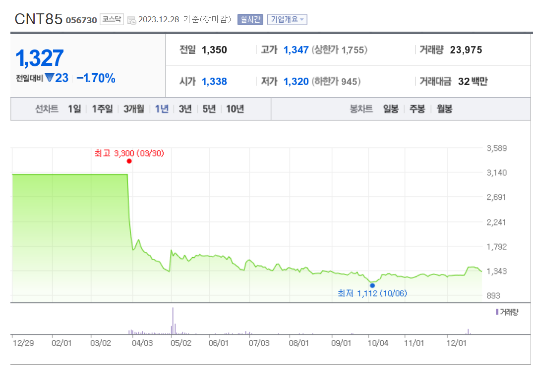 CNT85 현재 주가는 1,327원이며 전일 대비 -1.70%의 모습을 보이고 있습니다. CNT85의 주주현황을 살펴보면 신안캐피탈 주주가 전체 지분 42.83%를 소유하고 있습니다. CNT85는 건설 기업으로 시가 총액은 626억 원이며 발행 주식수는 47,166,956주 입니다. 외국인 보유 비중은 1.91% 이며 장중 거래량은 23,975를 기록했습니다. 매출액은 278억 원을 달성했습니다. EPS는 182원이며 BPS는 853원 입니다.
