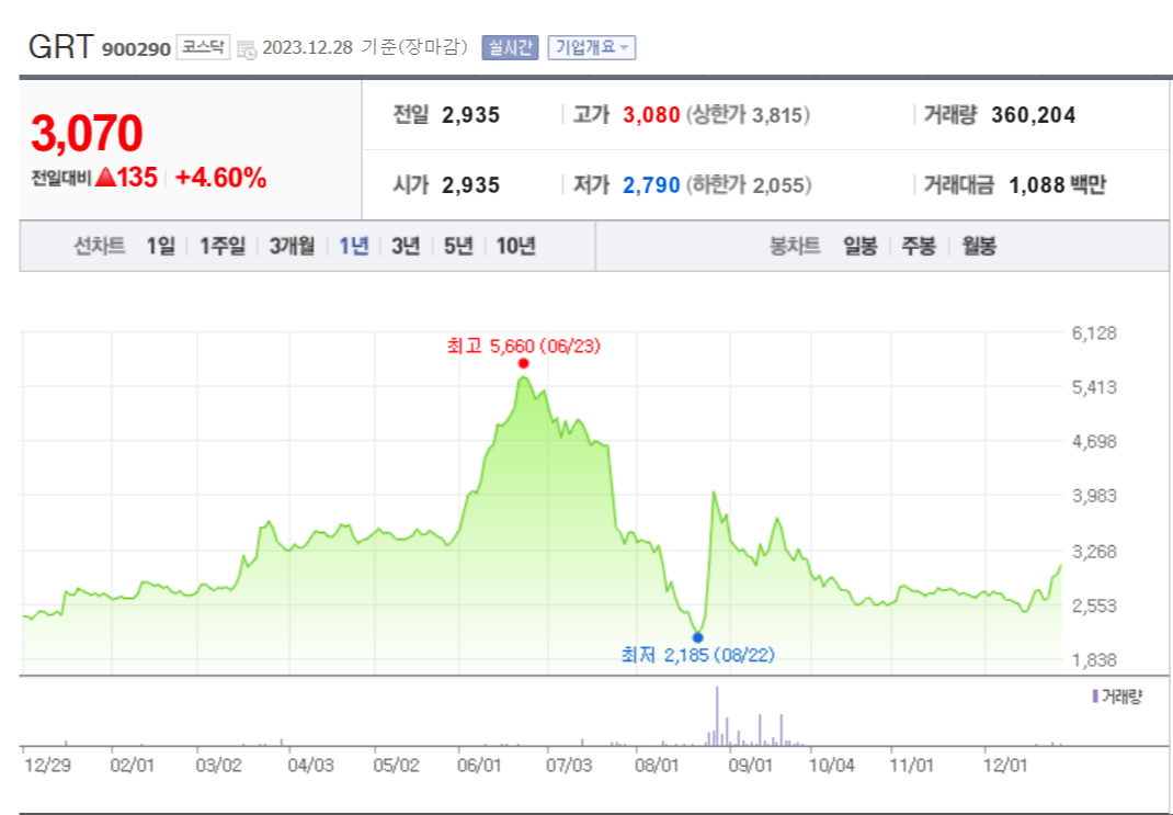 GRT 현재 주가는 3,070원이며 전일 대비 +4.60%의 모습을 보이고 있습니다. GRT의 주주현황을 살펴보면 ZHOU YONGNAN 주주가 전체 지분 53.42%를 소유하고 있습니다. GRT는 화학 기업으로 장중 기준으로 시가 총액은 2068억 원이며 발행 주식수는 67,375,000주 입니다. 외국인 보유 비중은 78.95% 이며 장중 거래량은 260,204를 기록했습니다. 매출액은 2,048억 원을 달성했습니다. EPS는 893원이며 BPS는 10,757원 입니다.