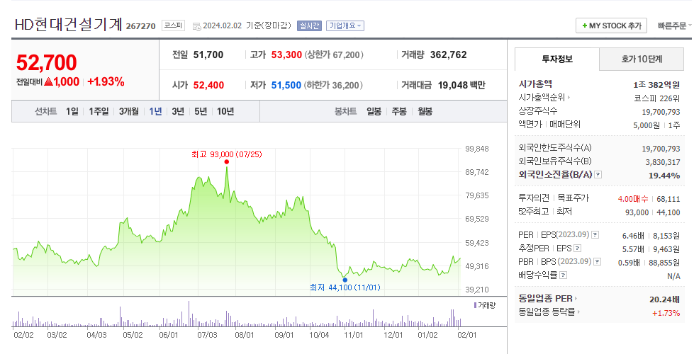 HD현대건설기계의 현재 주가는 52,700원이며 전일 대비 +1.93%의 상스을 보였습니다. 주주현황을 살펴보면 현대제뉴인(외 5인)이 지분의 36.15%를 소유하고 있습니다. HD현대건설기계는 기계 기업으로, 시가 총액은 1조 382억 원이며 발행 주식수는 19,700,793주입니다. 외국인 보유 비중은 19.44%이며, 장중 거래량은 362,762주를 기록했습니다. 또한, 매출액은 29,791억 원을 달성했습니다.