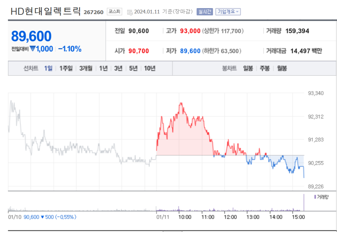 HD현대일렉트릭은 전기장비 기업으로 현재 주가는 89,600원이며 전일 대비 -1.10%의 하락세를 보이고 있습니다. 주주현황을 살펴보면 현대중공업지주(외 7인)이 지분 40.04%를 소유하고 있습니다. 시가 총액은 3조2298억 원이며 발행 주식수는 36,047,135주입니다. 외국인 보유 비중은 21.45%이며, 장중 거래량은 159,394주를 기록했습니다. 또한, 매출액은 19,055억 원을 달성했습니다.