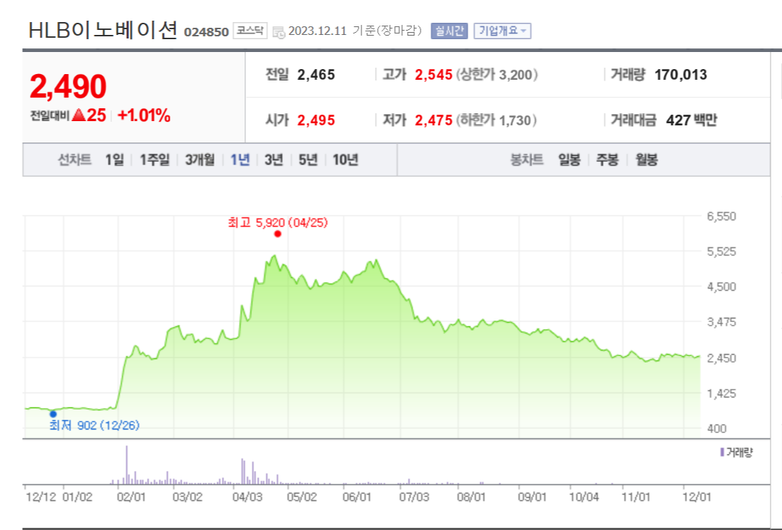 -2023년 6월 전년동기 대비 별도기준 매출액은 25.7% 감소, 영업이익 적자전환, 당기순이익은 85.5% 감소. 경기 침체 분위기가 고조되고, 전방 업체들의 반도체 재고량이 증가함에 따라 매출액 감소. HLB에 의하여 인수되어 사명을 HLB이노베이션으로 바꾸고 기존 반도체 위주의 사업에서 바이오로 주력 사업을 변경. 바이오의약품 개발 업체 베리스모테라퓨틱스 지분 19% 취득하여 바이오 사업 강화 기대.