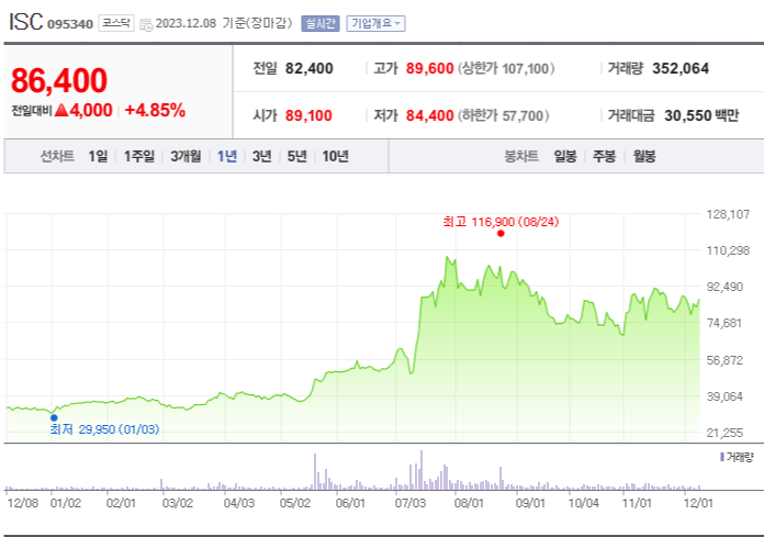 ISC는 반도체 및 관련장비 기업으로 주가는 86,400원이며 전일 대비 +4.85%의 모습을 보이고 있습니다. ISC의 주주현황을 살펴보면 SKC(외 2인)이 지분 48.89%를 소유하고 있습니다. ISC의 시가 총액은 1조8314억 원이며 발행 주식수는 21,197,058주 입니다. 외국인 보유 비중은 7.24% 이며 장중 거래량은 352,064를 기록했습니다. 매출액은 1,153억 원, 영업이익은 559억 원을 달성했습니다. EPS는 208원이며 ISC 주식 배당수익률은 0.69% 입니다.