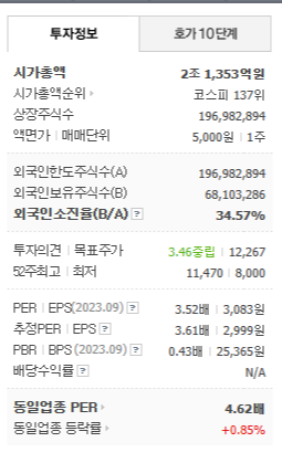 JB금융지주의 현재 주가는 10,840원이며 전일 대비 +0.46%의 상승세를 보이고 있습니다. 주주현황을 살펴보면 삼양사(외 2인)이 지분 14.61%를 소유하고 있습니다. JB금융지주는 상업은행 기업으로 시가 총액은 2조1215억 원이며 코스피 137위 기업입니다. 발행 주식수는 196,982,894주입니다. 외국인 보유 비중은 34.57%이며 장중 거래량은 166,181주를 기록했습니다. 또한, JB금융지주의 매출액은 14,134억 원을 달성했습니다.