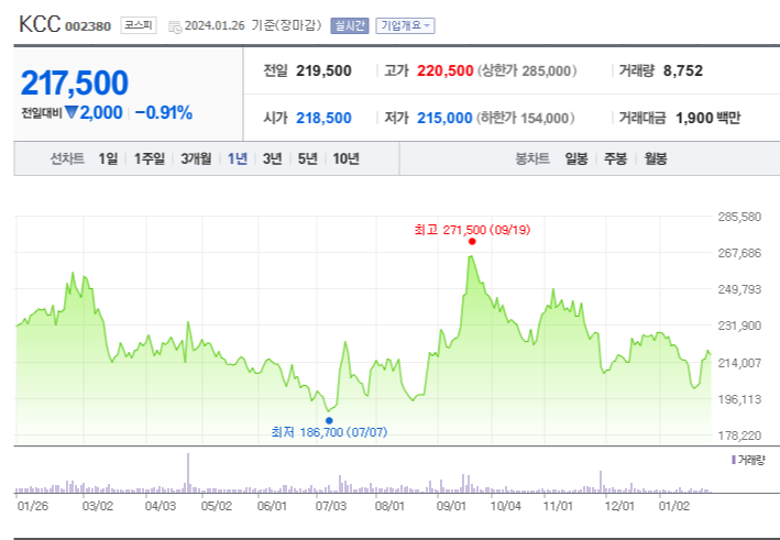 건설자재업체 KCC는 현재 주가가 217,500원으로 전일 대비 -0.91%의 변동을 보이고 있습니다. KCC의 주주구조를 살펴보면 정몽진 외 13인이 36.55%의 지분을 보유하고 있습니다. KCC의 시가총액은 1조 9,150억 원이며, 코스피 146위 기업입니다. 발행주식수는 8,886,471주입니다. 외국인 지분율은 12.19%를 차지하고 있으며, 장중 거래량은 8,752주에 달합니다. KCC는 4조 7,060억 원의 매출을 달성했습니다.