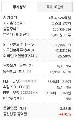 KG모빌리티의 현재 주가는 7,770원이며, 전일 대비 -1.27%로 하락하였습니다. 주주 현황을 살펴보면 케이지이티에스(외 7인)이 지분의 58.85%를 소유하고 있습니다. KG모빌리티는 자동차 기업으로, 시가 총액은 1조 4,770억 원이며, 코스피 177위 기업입니다. 발행 주식수는 186,956,024주입니다. 외국인 보유 비중은 25.59%이며, 거래량은 223,476주입니다. 매출액은 29,951억 원을 기록하였습니다.