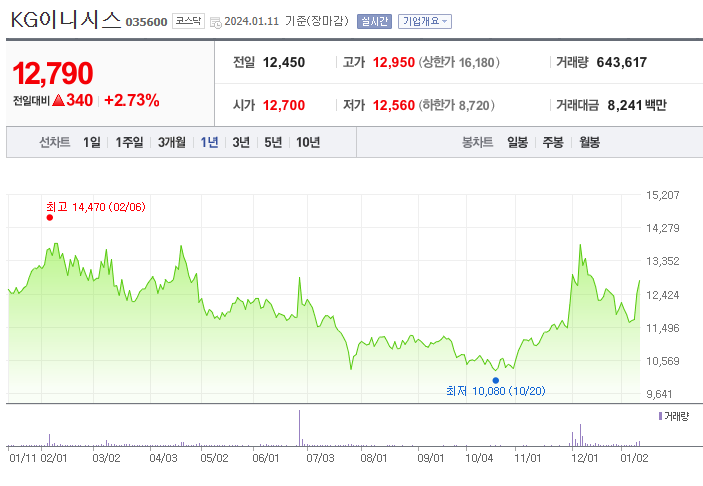 KG이니시스 현재 주가는 12,790원이며 전일 대비 +2.73%의 모습을 보이고 있습니다. KG이니시스의 주주현황을 살펴보면 KG케미칼 주주가 전체 지분 40.89%를 소유하고 있습니다. KG이니시스는 인터넷 서비스 기업으로 시가 총액은 3569억 원이며 발행 주식수는 27,904,434주 입니다. 외국인 보유 비중은 9.90% 이며 장중 거래량은 643,617을 기록했습니다. 매출액은 9,913억 원을 달성했습니다.