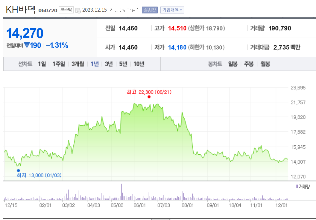 KH바텍는 휴대폰 및 관련부품 기업입니다. 대표자는 남광희 이며 설립일은 1992/11/23, 주식 상장일은 2002/05/21입니다. 전체 종업원 수는 97명 이고 본사 주소는 경북 구미시 1공단로10길 53-12입니다.