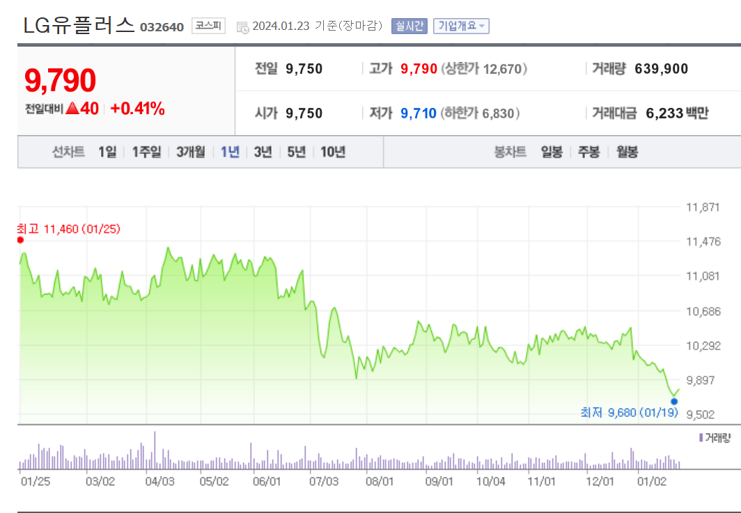 LG유플러스는 대한민국의 통신사로, LG그룹의 일원으로 소속되어 있습니다. 회사는 1996년에 설립되었으며, 이동통신 서비스, 인터넷 서비스, IPTV 등 다양한 통신 서비스를 제공하고 있습니다. LG유플러스는 국내 통신사 중에서도 품질과 서비스에 대한 높은 신뢰도를 가지고 있습니다. 회사는 네트워크 인프라를 지속적으로 개선하고, 고객들에게 안정적이고 빠른 통신 서비스를 제공하기 위해 노력하고 있습니다.또한, LG유플러스는 5G 기술에 대한 선도적인 역할을 수행하고 있습니다. 5G 네트워크의 상용화를 위해 다양한 연구와 개발을 진행하고 있으며, 이를 통해 고객들에게 더욱 빠르고 혁신적인 서비스를 제공하고자 합니다.회사의 주식은 주식시장에서 거래되고 있으며, 투자자들에게 많은 관심을 받고 있습니다. LG유플러스는 안정적인 경영과 높은 수익성을 바탕으로 주주들에게 안정적인 이익을 제공하고 있습니다. 앞으로 LG유플러스는 기술 혁신과 서비스 품질 개선을 통해 통신 시장에서의 경쟁력을 강화하고, 고객들에게 더 나은 통신 서비스를 제공하기 위해 노력할 것입니다.