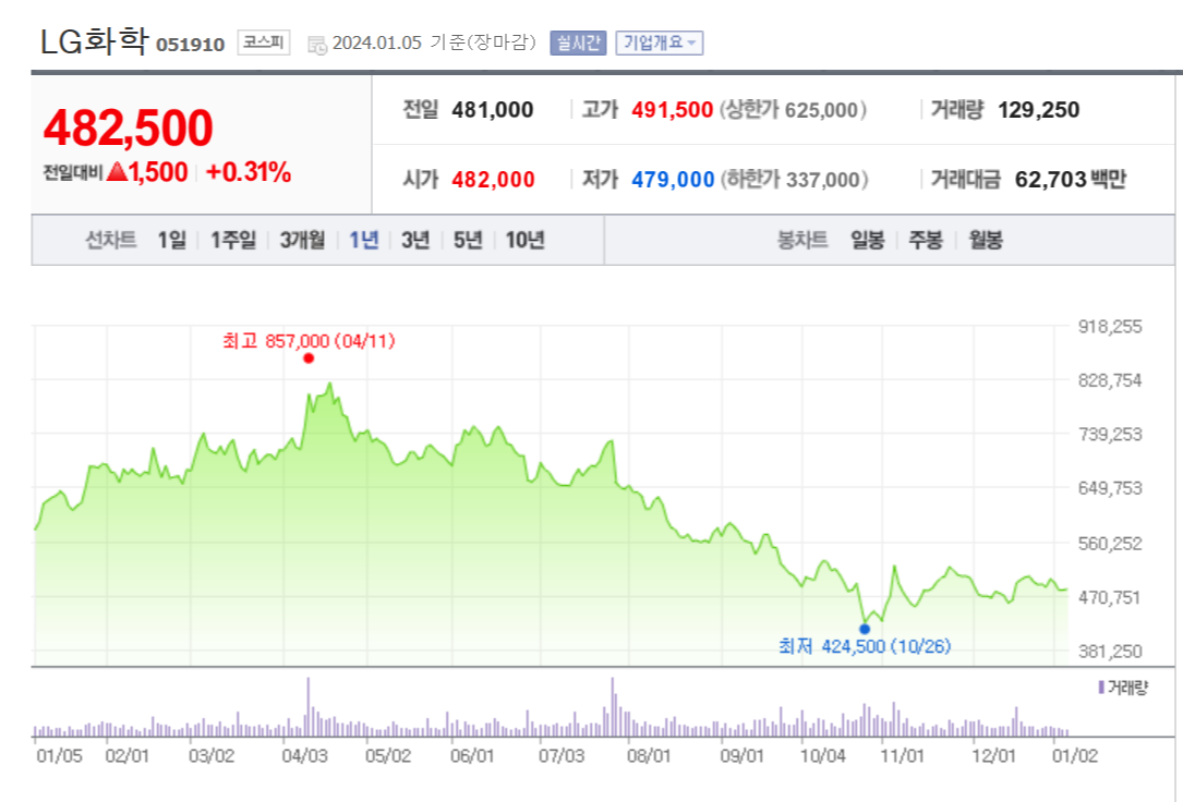 LG화학의 현재 주가는 482,500원이며 전일 대비 +0.31%의 변동을 보였습니다. 이 기업의 주주 구성은 LG(외 2인)이 33.37%의 지분을 소유하고 있습니다. LG화학은 화학 분야의 기업으로 시가 총액은 34조608억 원으로 코스피 10위 기업입니다. 이 회사의 발행 주식수는 70,592,343주이며, 외국인 보유 비중은 42.98%입니다. 장 중 거래량은 129,250 기록했으며 매출액은 421,150억 원입니다.