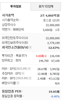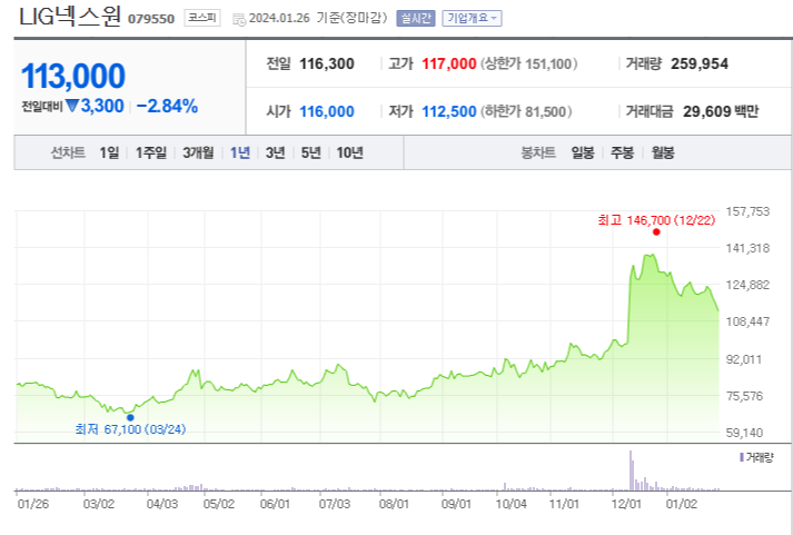 LIG넥스원은 현재 주가가 113,000원이며 전일 대비 -2.84%의 변동을 보이고 있습니다. 주주현황을 살펴보면 엘아이지(외 11인)이 지분의 42.54%를 소유하고 있습니다. LIG넥스원은 상업서비스 기업으로, 시가 총액은 2조6180억 원이며 코스피 121위 기업입니다. 발행 주식수는 22,000,000주입니다. 외국인 보유 비중은 12.63%이며, 장중 거래량은 259,954주를 기록했습니다. 또한, 매출액은 16,285억 원입니다.
