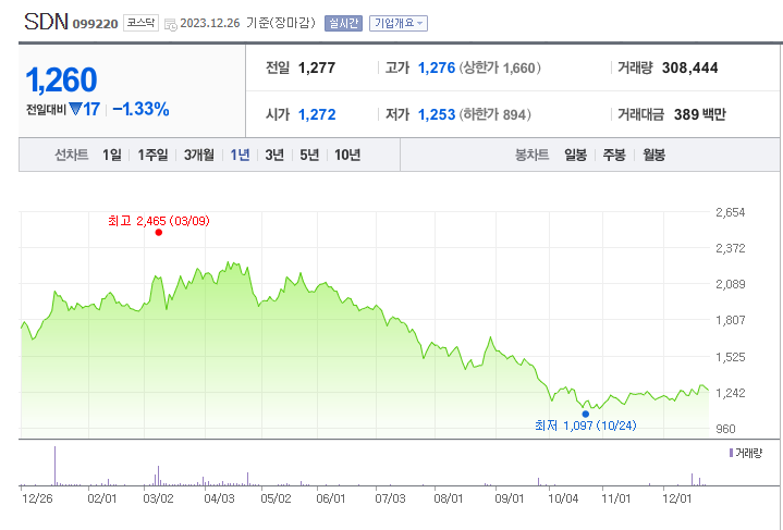SDN 현재 주가는 1,260원이며 전일 대비 -1.33%의 모습을 보이고 있습니다. SDN의 주주현황을 살펴보면 최기혁 주주가 전체 지분 14.68%를 소유하고 있습니다. SDN는 에너지 시설 및 서비스 기업으로 시가 총액은 708억 원이며 발행 주식수는 56,171,811주 입니다. 외국인 보유 비중은 0.91% 이며 장중 거래량은 308,444를 기록했습니다. 매출액은 460억 원을 달성했습니다. EPS는 21원이며 BPS는 1,955원 입니다.