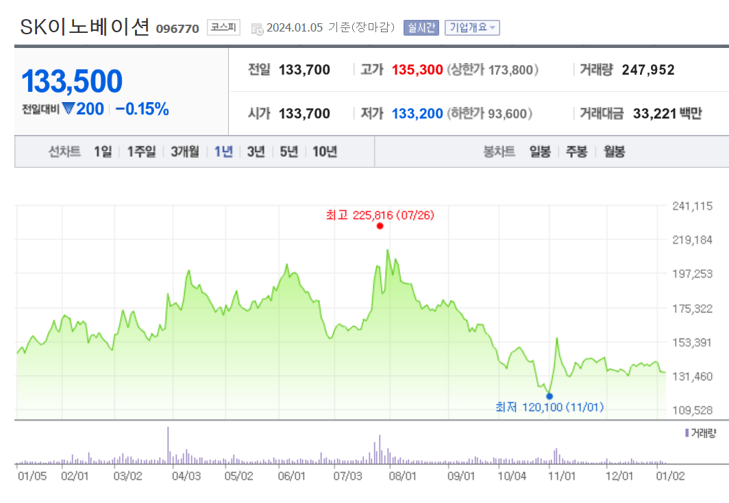 SK이노베이션의 현재 주가는 133,500원으로 전일 대비 -0.15%의 하락을 보여주고 있습니다. 주주현황을 알아보면 SK(외 13인)이 지분 34.48%를 소유하고 있습니다. SK이노베이션은 석유 및 가스 기업으로, 시가 총액은 13조4375억으로 코스피 22위 기업입니다. 발행 주식수는 100,655,564주입니다. 외국인 보유 비중은 21.86%이며, 거래량은 247,952주를 기록했습니다. 매출액은 577,592억 원으로 달성되었습니다.